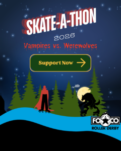 On March 2, 2026, the skaters of Foco Roller Derby will participate in the Skate-A-Thon. Skate-A-Thon is an annual event for FCRD and one of our most important fundraisers of the year, where skaters dress in opposing team costumes and participate in a two hour skating marathon. This year pits Team Werewolf against Team Vampire. While this annual event provides FCRD skaters with a fun opportunity to test their speed and endurance in a rare contact-free environment, it is also a tradition that hearkens back to the origins of our beloved sport.